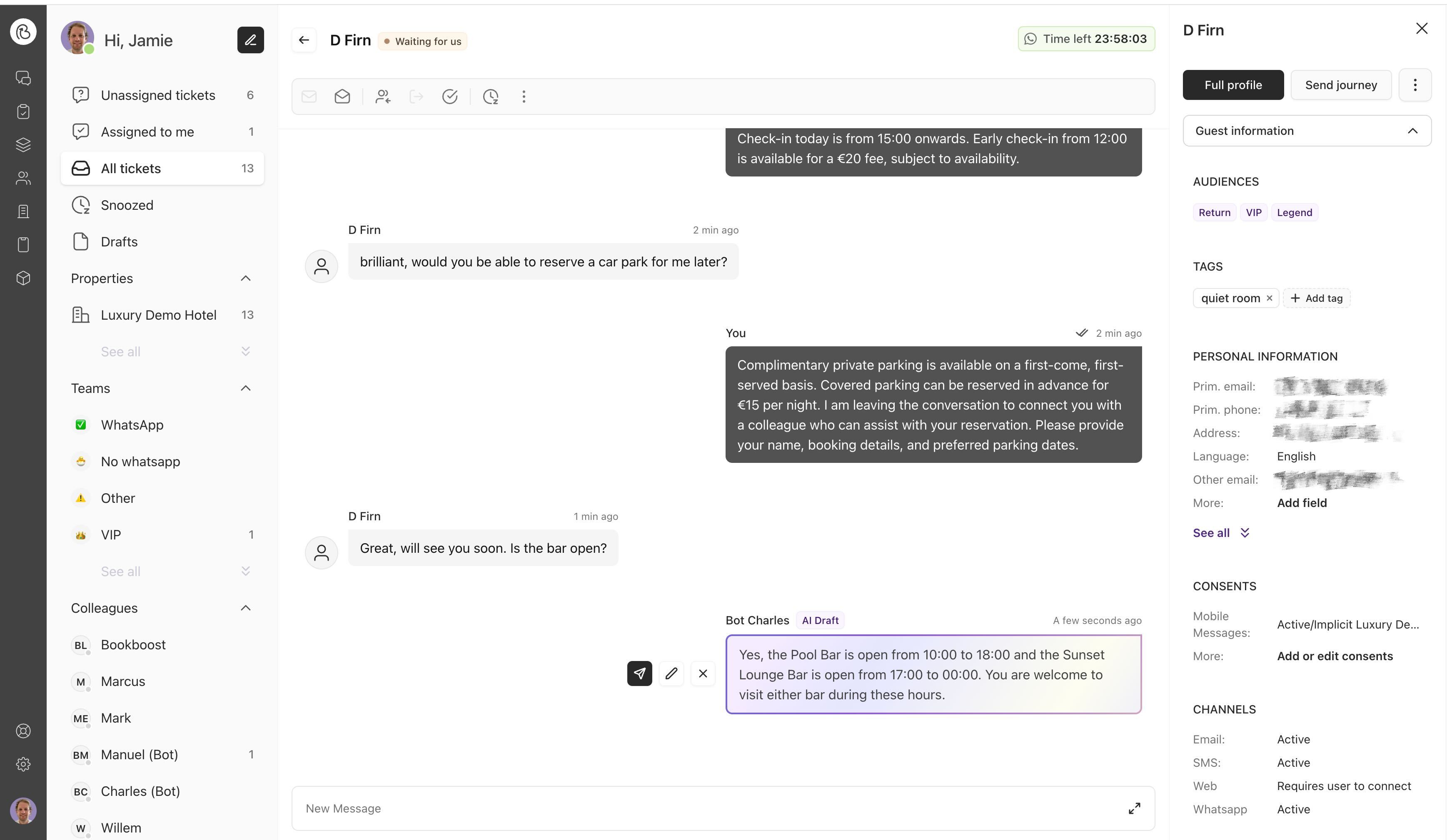 Every hotel team knows the feeling. The inbox is full. Guests are asking the same questions across WhatsApp, email, and Booking.com. Your staff are copying and pasting the same check-in instructions for the third time today. And somewhere in the middle of all that, a guest with a genuine problem is still waiting for a reply.